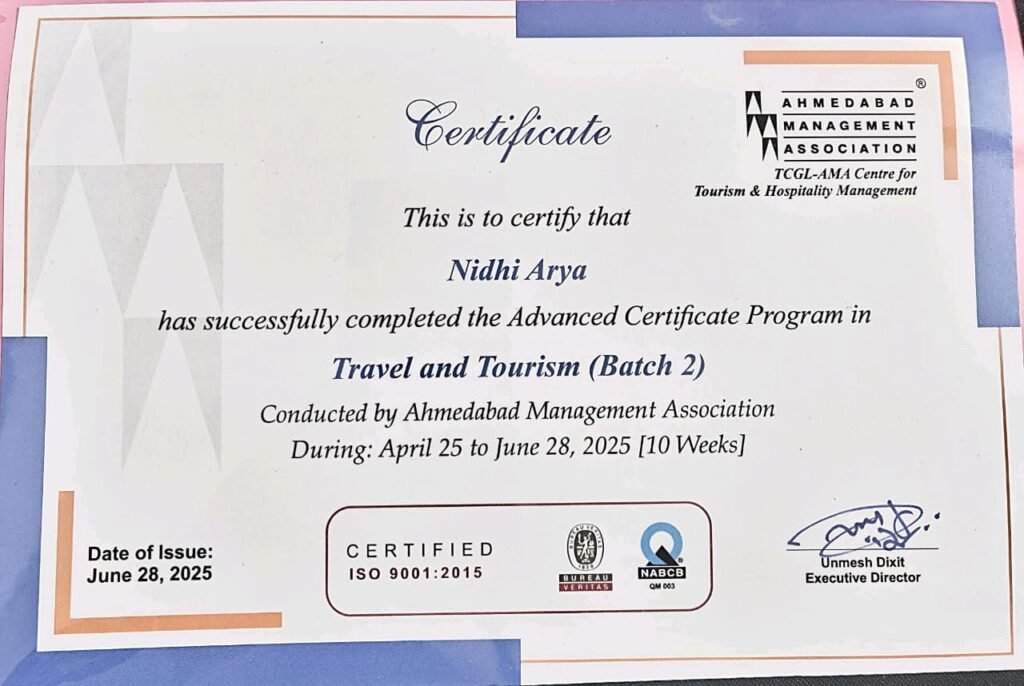 Within a year of inception, Nidhi Arya joined as a Co – founder in Prasthan Tours N Travels, bringing her strong educational background and natural understanding of customer service into the business. With Abhishek’s industry expertise and Nidhi’s keen grasp of travel ethics and planning, the company grew steadily with a clear vision — to deliver seamless, reliable, and personalized travel experiences. To add on to the experience and learning she did an Advanced certificate Program in Travel and Tourism from a renowned institute “Ahmedabad Management Association”.